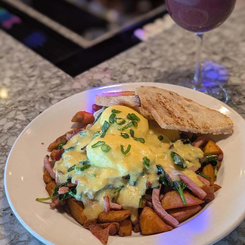 Two poached eggs, black forest smoked ham, bacon, spinach hash, hollandaise, breakfast potatoes