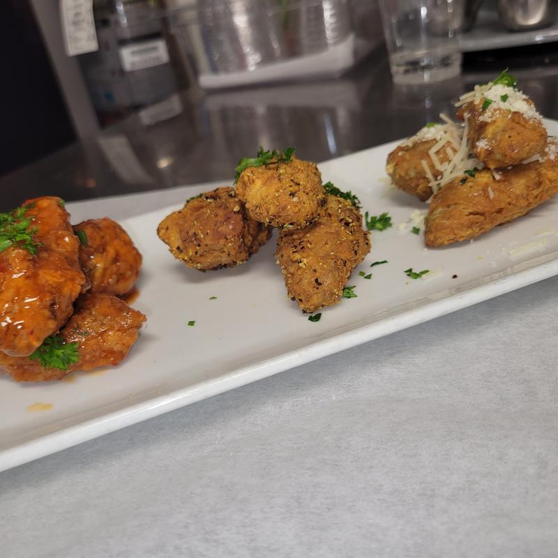 Breaded, Fried, Tossed. | Three sauces, three wings each | Choices: Buffalo | BBQ | Lemon Pepper | Spicy & Sweet | Garlic Parm