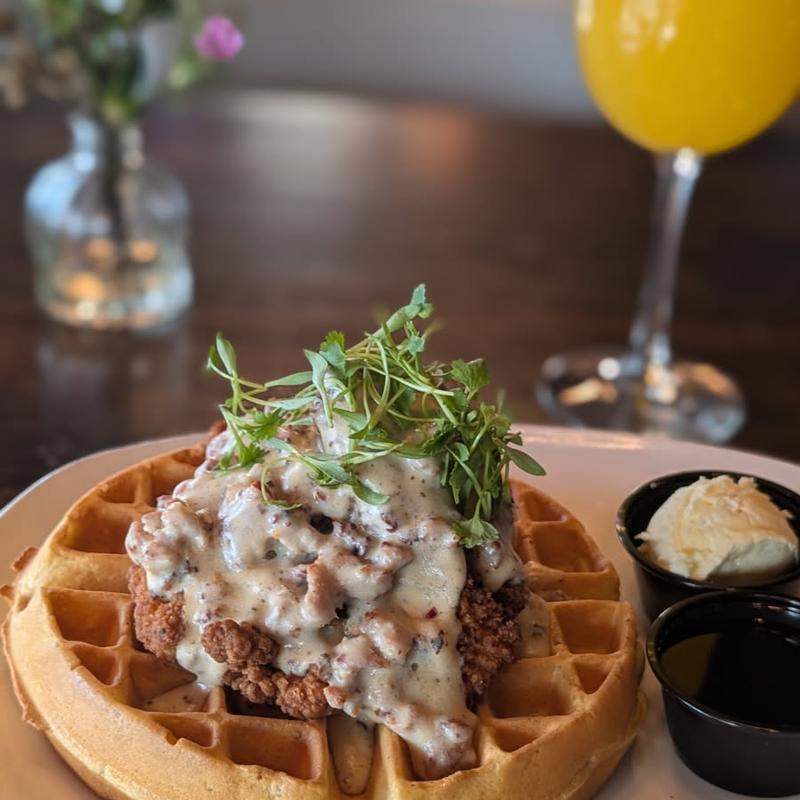 Fried chicken breast, pork sausage country gravy, Belgian waffle, butter, syrup