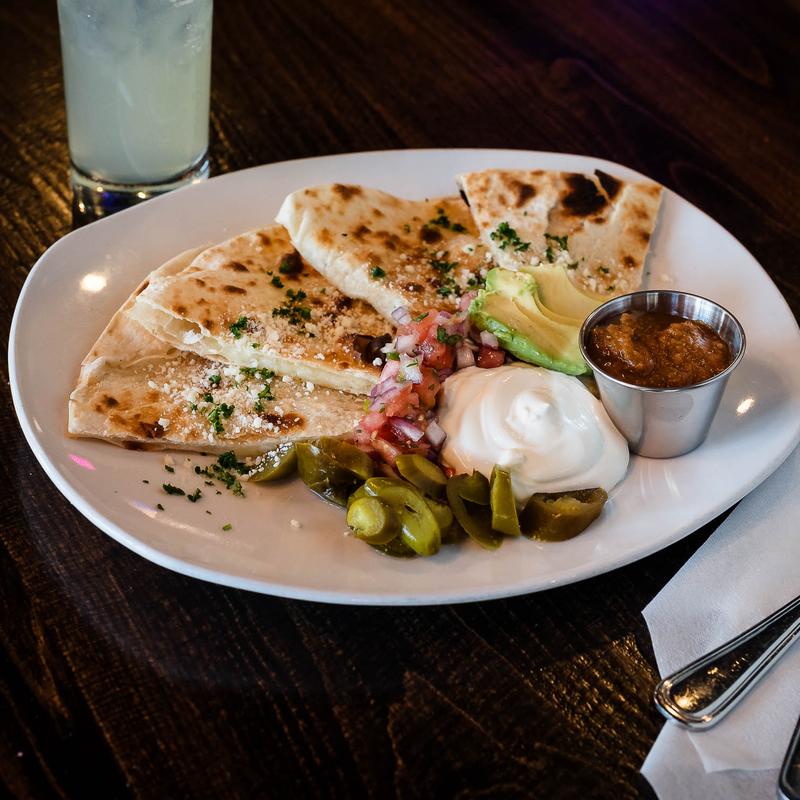 Queso blanco, cilantro, jalapeño. Served with Guacamole, Sour Cream, Pico | Add chicken or pulled pork for $4