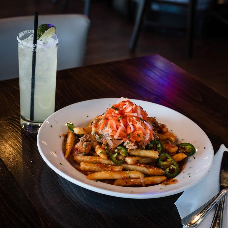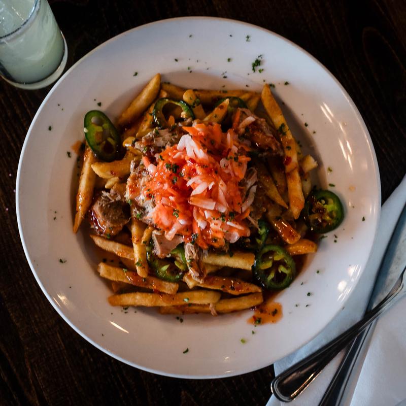 Fresh chips, queso cheese, cotija, white cheddar, jalapeños, cilantro, crema drizzle | Add Shredded Chipotle Chicken +$4.00 | Pulled Pork +$4.00