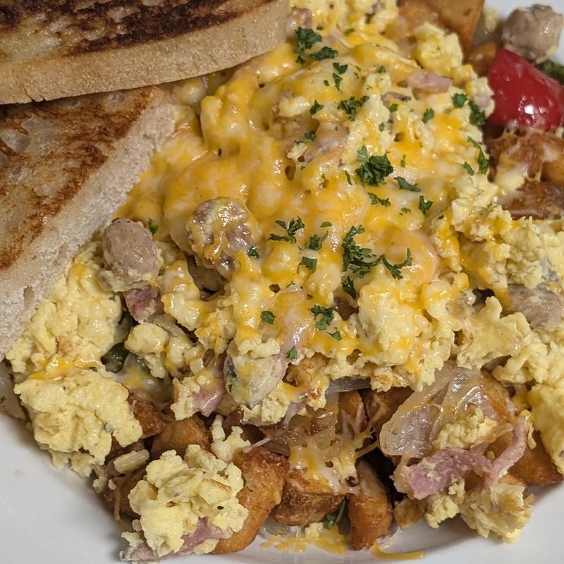 Eggs, sausage, black forest ham, cheddar, breakfast potatoes, sourdough toast